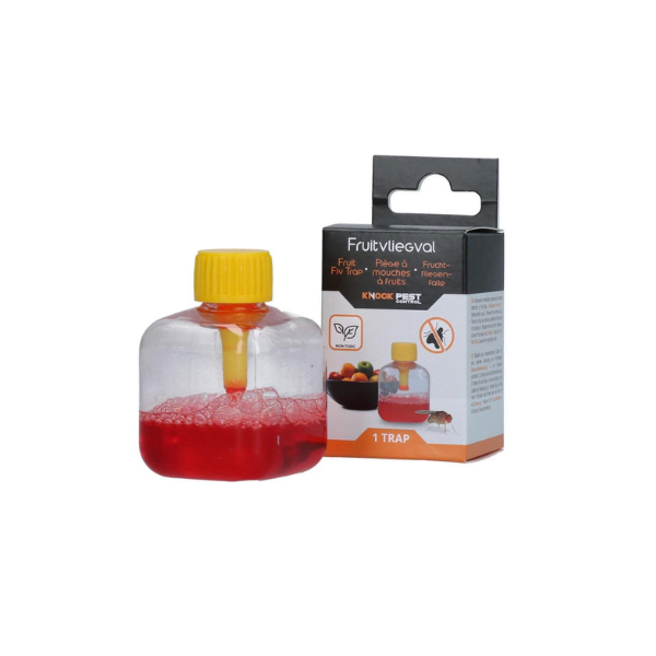 Fruitvliegjes val van Knock Pest met een niet giftige lokstof. Door de onweerstaanbare lokstof komen de fruitvliegjes in de val terecht, en kunnen zij hier vervolgens niet meer uit.