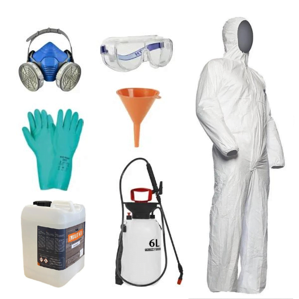Zoekt u een middel tegen schimmels en andere micro-organismen voor verschillende soorten oppervlakten? Schimmelbestrijdingsmiddel NTK 20L is een snel fixerend houtverduurzaamheidsmiddel maar daarnaast ook voor het beschermen van oppervlakten tegen schimmels en andere micro-organismen en dus op verschillende manieren te gebruiken. Het Schimmel Pakket los is voor het veilig aanbrengen van bestrijdingsmiddelen zoals Perfacs, Embasol of NTK schimmel dood. Dit schimmel pakket is samengesteld om de veiligheid te waarborgen. ongedierteproducten vind het belangrijk dat de basis goed en veilig is om behandelingen tegen houtworm of schimmel zo veilig mogelijk te doen. De professionals gebruiken BPM’s. Wij hebben een basis samenstelling gemaakt om veilig te behandelen zo zit er een gasmasker + filters, veilige handschoenen, veiligheidsbril en een overal in. Ook willen we de behandeling zo makkelijk mogelijk maken dus hebben we gekeken naar een goeie werkende druk spuit en een trechter om zo makkelijk mogelijk de vloeistof in de druk spuit te gieten.